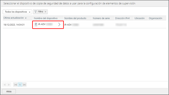 En la lista de la página [Seleccionar el dispositivo de copia de seguridad de datos a usar para la configuración de elementos de supervisión], seleccione los datos de valores de configuración de dispositivo de los que hacer una copia de seguridad desde el dispositivo de referencia.
