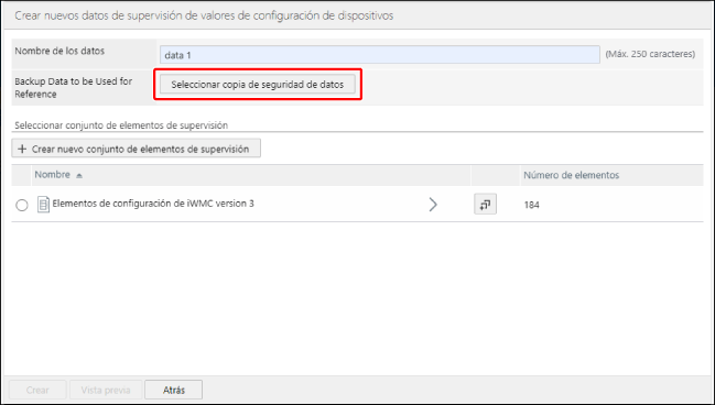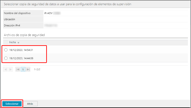 En la página [Seleccionar el dispositivo de copia de seguridad de datos a usar para la configuración de elementos de supervisión], seleccione la copia de seguridad de datos que se va a usar para la supervisión, y haga clic en [Seleccionar].