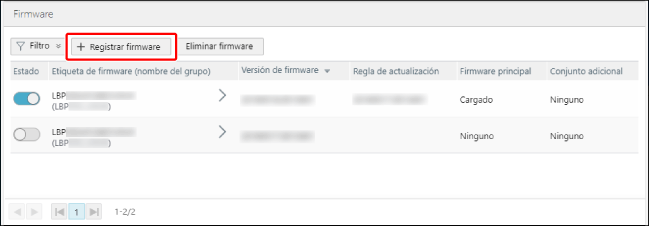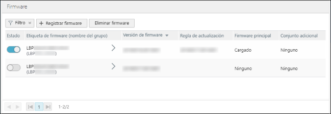 [Etiqueta de firmware (nombre del grupo)] | Muestra el nombre del grupo de firmware. Si hace clic en el nombre del grupo de firmware, se mostrará la página [Detalles de firmware] y podrá comprobar la información del firmware. |