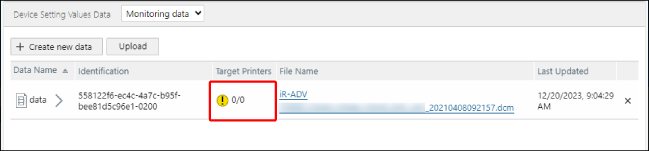在 [Device Setting Values Data] 页面上的列表中,对于设备设置值数据单击 [Target Printers]。
