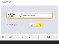 حدد سواء إرسال أو عدم إرسال فاكسات الإنترنت إلى الوجهات عن طريق خادم البريد. حدد <تشغيل> إذا كنت تريد إرسال فاكسات الإنترنت عن طريق خادم البريد. حدد <إيقاف> إذا كنت تريد إرسال البيانات مباشرةً إلى مستلم على نفس الشبكة المحلية (LAN). بالإرسال مباشرةً إلى مستلم، يمكنك إرسال كم كبير من البيانات دون وضع حمل على خادم البريد.