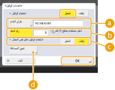 عيّن <استخدام الوكيل> على <تشغيل>، وقم بتكوين الإعدادات اللازمة، واضغط على <موافق>.