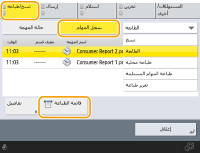 (شاشة الحالة)، تظهر شاشة مراقبة الحالة، مما يتيح لك التحقق من سجل استخدام كل وظيفة، مثل النسخ والطباعة وإرسال بريد إلكتروني وإرسال/استقبال فاكسات/فاكسات إنترنت، وغير ذلك. ومن هذه الشاشة، يُمكنك أيضًا طباعة سجل استخدام كل وظيفة.