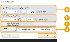 لا يُمكنك تهيئة إعدادات تقرير نشاط الفاكس عند تعيين <عرض سجل المهمة> في <إعدادات الإدارة> على <إيقاف>. بالإضافة إلى أنه إذا قمت بتغيير <عرض سجل المهمة> في <إعدادات الإدارة> من <إيقاف> إلى <تشغيل>، فإن <طباعة/إرسال كل عدد محدد من عمليات الإرسال> و<طباعة/إرسال في الوقت المحدد> في تقرير نشاط الفاكس يتغيران تلقائيًا إلى <إيقاف>. <عرض سجل المهمة>