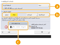 اضبط تاريخ/وقت الجهاز. ينبغي ضبط هذه الإعدادات على نحو صحيح لأن التاريخ/الوقت يُستخدمان في حالات مثل إرسال بريد إلكتروني تلقائي في وقت محدد.