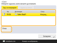 (Стоп) на контролния панел, докато задание за изпращане/факс се обработва и се показва екранът <Факс>/<Сканиране и изпращане>, ще се покаже изскачащ екран, който директно отменя изпълняваните в момента задания. Когато се изпълняват няколко задания, можете да изберете кое задание искате да отмените: последно направеното задание или заданието, което е в процес на изпращане. (<Задача за отмяна при натискане на Стоп>)Ако има задание, което е започнато след натискането на