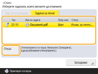 (Стоп) на контролния панел, докато задание за изпращане/печат се обработва и се показва екран, който води към <Зад. за изпращане>/<Задачи за печат>, изпълняваното задание за изпращане/печат спира временно и се показва <Зад. за изпращане>/<Задачи за печат>.