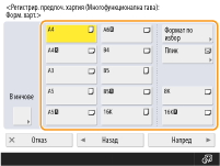 Ако <Винаги задавай> под <Настр. по подразб. на Многофункц. тава> е с настройка <Предпоч. хартия>, ще се покаже екран, който ви позволява да изберете любима хартия, когато заредите хартия в многофункционалната тава. <Настр. по подразб. на Многофункц. тава>