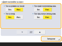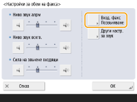 Дори ако тонът за входящ факс е настроен на <Изкл.>, ще се издава тон при входящ факс по време на режим на заспиване, ако консумацията на енергия в режим на заспиване е настроена на ниска. <Консумация на енергия в режим на покой>