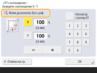Можете да изплзв.бут.с цфр.>, можете да въведете числови стойности чрез числовите бутони вдясно на сензорния дисплей.Пример: Екран на настройката <XY съотнош.>