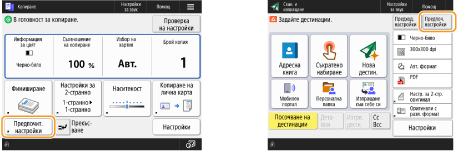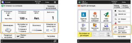 Можете да промените бутоните за настройки, които се показват в екраните с основни функции (за копиране, факс и сканиране). Можете също да показвате различен екран с основни функции, персонализиран за всеки влязъл потребител.