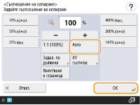 Ако зададете <Авто>, трябва да изберете ръчно формат на хартията. Ако не изберете формат на хартията, съотношението на копиране автоматично се задава така, че да съответства на формата на хартията, заредена в касетата за хартия 1.