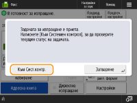 Когато <Извежд. съобщение, когато задачата е приета> е зададено на <Да>, екранът <Сист. контрол> може да се изведе от следващия екран, който се показва след получаване на задача за изпращане. <Извежд. съобщение, когато задачата е приета>