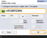 За да изпратите факсове в чужбинаВъведете международния код за достъп, кода на държавата и факс номера в този порядък. Ако не можете успешно да се свържете с дестинацията в чужбина, натиснете <Пауза> за въвеждане на пауза между номера и следващия номер.