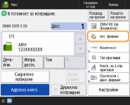 Избиране на име на изпращачНа екрана с основни функции за факс натискането на <Настройки>