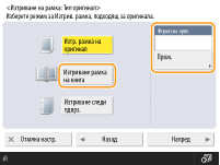 Ако размерът, показан в <Формат оригин.>, е различен от размера на книгата, натиснете <Промяна> за избиране на размера. Можете да задавате режим за изтриване на рамка на книга само за оригинали с форматите, показани на дисплея на сензорния панел.