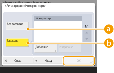 Настройката за адрес като изключение се прилага само към комуникацията, получена от посочения IP адрес с използване на обозначения номер на порт. Натиснете <Добавяне>, въведете номер на порт и натиснете <OK>. Можете да регистрирате до 50 порта за един адрес като изключение за двата IPv4/IPv6.