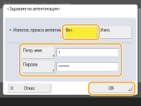 За използване на функцията за удостоверяване на прокси сървъра натиснете това и конфигурирайте информацията за удостоверяване. На екрана, който се показва, натиснете <Вкл.>, въведете потребителското име и парола за използване на удостоверяване на прокси и натиснете <OK>.