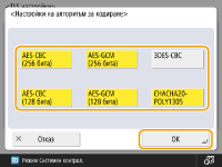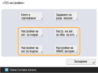 Ако зададете <Метод на кодиране на формат към FIPS 140> на <Вкл.>, можете да накарате метода на шифроване на TLS комуникацията да съответства на одобрения от правителството на САЩ стандарт FIPS (Federal Information Processing Standards) 140. <Метод на кодиране на формат към FIPS 140>