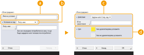 Изберете как да се третират документите, които отговарят на условията. Когато <Задръж като Спод. зад.> е избрано, можете да зададете <ID за заместване> за посочване на извеждане на потребителско име към регистъра при печат. Изберете <Отказ> за отказване на документа.