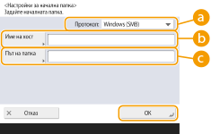 Регистриране на персонална папка и информация за удостоверяване за всеки потребителАко <Метод на спецификация на персон. папка> е зададено на <Регистриране за всеки потребител>, регистрирайте една от следните като персонална папка за всеки потребител. Регистрираните настройки са същите и същата персонална папка е регистрирана, без значение къде е конфигурирана настройката.