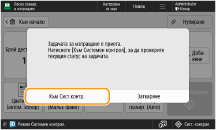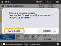 Когато <Извежд. съобщение, когато задачата е приета> е зададено на <Вкл.>, екранът <Сист. контрол> може да се изведе от следващия екран, който се показва след получаване на задача за изпращане. <Извежд. съобщение, когато задачата е приета>