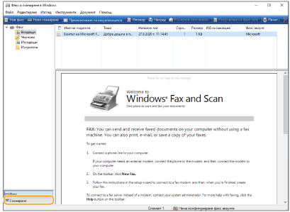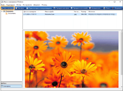 Когато сканирането завърши, сканираният документ се показва в списъка с файлове в екрана [Факс и сканиране в Windows] и се запаметява в папката [Сканирани документи] от [Документи].