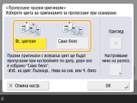 Могат да бъдат посочени само местоположения от типа <E-Mail> или <Файл>, когато е зададено <Пропускане празни оригинали>. Ако е зададено местоположение с тип, различен от <E-Mail> или <Файл>, изпращането не може да се изпълни.