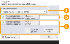 Изберете нивото на шифроване. Ако искате да използвате <Acrobat 9.0 или еквивал./256-bit AES> вместо <Acrobat 10.0 или еквивал./256-bit AES> като ниво на шифроване, използвайте тази настройка, за да промените избора, който можете да направите.