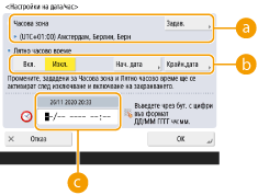 Ако сте променили настройката на <Часова зона> или <Лятно часово време>, трябва да рестартирате машината, като изключите захранването. Натиснете превключвателя на захранването, за да изключите машината (Изключване на машината). Когато изминат 10 или повече секунди след изключването на сензорния панел и индикаторите, включете машината отново (Включване на машината).