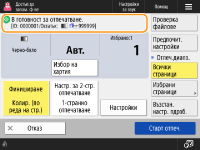 Показва състоянието на настройките, като напр. размер на хартията за печат и броя разпечатки. Уверете се, че сте потвърдили настройките, за да отпечатате правилно. За да промените настройките, натиснете бутона под секцията за показване. За да промените броя разпечатки, въведете броя чрез бутоните с цифри.