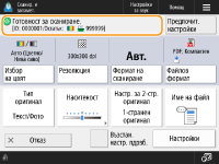 Когато натиснете <Сканиране и запаметяване> на екрана <Начало> и след това натиснете <Мрежа> или <Запаметяващ носител>, за да сканирате оригинали, се показва следният екран за настройка.