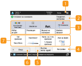 Показва състоянието на настройките, като напр. разделителна способност и формат на сканиране. Уверете се, че сте потвърдили настройките, за да сканирате правилно. За да промените настройките, натиснете бутона под секцията за показване. За информация относно файловите формати вижте