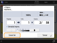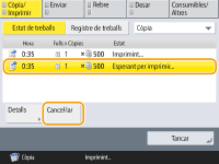 (Aturar) al tauler de control mentre es mostra la pantalla de funcions bàsiques de còpia, el treball de còpia queda en pausa i apareixen el missatge <AturarSeleccioneu el treball de còpia que voleu cancel·lar.> i la llista de treballs de còpia. Podeu seleccionar el treball de còpia de la llista i cancel·lar el treball prement <Cancel·lar>.Si inicieu la sessió amb la gestió d'autenticació personal i la tanqueu després de prémer