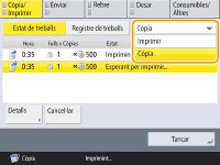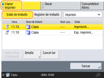 (Aturar) al tauler de control quan els treballs de còpia estan en espera, tots els treballs de còpia queden en pausa i apareixen el missatge <AturarSeleccioneu el treball de còpia que voleu cancel·lar.> i la llista de treballs de còpia. Podeu seleccionar un treball de còpia de la llista i cancel·lar el treball prement <Cancel·lar>. Si voleu reprendre la còpia, premeu <Reprendre còpia>. |