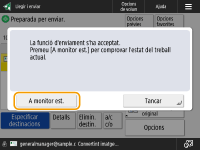 Si <Mostrar avís en acceptar el treball> està establert en <On>, la pantalla <Monitor estat> pot aparèixer a partir de la pantalla següent mostrada després de rebre un treball d'enviament. <Mostrar avís en acceptar el treball>