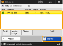 Aquesta funció permet desar els documents rebuts que coincideixin amb unes condicions concretes en una ubicació d'emmagatzematge específica (bústia de fax confidencial). La bústia de fax confidencial conté diverses bústies, i cadascuna d'elles es pot protegir amb una contrasenya. Si especifiqueu una condició, com desar tots els documents rebuts de l'empresa A a la bústia número 10, podreu consultar només els documents que necessiteu. A més, aquesta funció permet establir una contrasenya per evitar que persones no autoritzades vegin documents confidencials. Si l'indicador Processant/Dades del tauler de control emet una llum verda permanent, seguiu els procediments següents per comprovar/imprimir els documents desats.