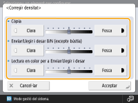 Quan s'estableix en <Fosca>, augmenten les àrees impreses al nivell màxim de densitat. Quan s'estableix en <Clara>, les àrees omplertes, el text i les línies es poden imprimir amb tons mitjans amb punts que falten. Aquesta configuració s'hauria d'utilitzar principalment per ajustar les densitats intermèdies.