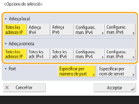 Especifiqueu l'adreça IP d'aquest equip a <Adreça local> i especifiqueu l'adreça IP de l'interlocutor de la comunicació a <Adreça remota>.