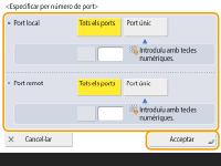 Premeu <Especificar per número de port> per utilitzar números de port quan especifiqueu els ports als quals s'aplica IPSec. Seleccioneu <Tots els ports> per aplicar IPSec a tots els números de port. Per aplicar IPSec a un número de port específic, premeu <Port únic> i introduïu el número de port. Després d'especificar els ports, premeu <Bé>. Especifiqueu el port d'aquest equip a <Port local> i especifiqueu el port de l'interlocutor de la comunicació a <Port remot>.