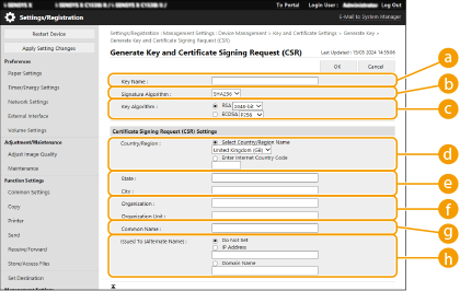 Els certificats generats en aquest equip no tenen una signatura de CA, fet que pot causar errors de comunicació amb alguns interlocutors de la comunicació. Per sol·licitar un certificat amb una signatura de CA, calen dades de sol·licitud de signatura de certificat (CSR). Un usuari que iniciï sessió amb privilegis d'administrador pot generar una CSR.