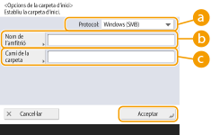Desament d'una carpeta personal i informació d'autenticació per a cada usuariSi s'estableix <Mètode d'especificació de carpeta personal> en <Desar per cada usuari>, deseu una de les opcions següents com a carpeta personal per a cada usuari. Les opcions desades són les mateixes i es desa la mateixa carpeta personal, independentment d'on es configuri l'opció.
