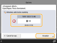 Introduïu l'hora d'enviament/desament i premeu <Bé>.