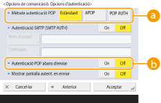 Per portar a terme l'autenticació utilitzant el servidor POP3, premeu <On>.