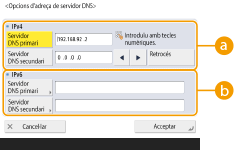 Premeu <Servidor DNS primari> i introduïu una adreça IPv6 del servidor DNS. No podeu introduir adreces que comencen amb "ff" (adreça multidifusió), adreces que només continguin "0" ni o adreces d'enllaç local.