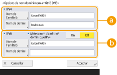 Per establir el nom amfitrió i el nom de domini perquè coincideixin amb els d'IPv4, premeu <On> en <Mateix nom d'amfitrió/domini que IPv4>. Per establir-los perquè siguin diferents dels d'IPv4, premeu <Off>.