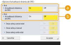 Per actualitzar automàticament la informació quan la correspondència entre el nom d'amfitrió i l'adreça IP canvia en un entorn com ara DHCP, premeu <On> a <Actualització dinàmica de DNS>.