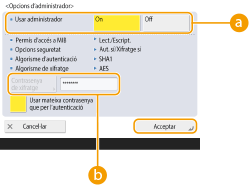 Si "Administrator" està desactivat, no podeu establir <Opcions d'Administrator> (l'opció <Usar Administrator> es fixa en <Off>).
