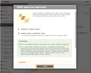 Když kliknete na ikonu, může se stát, že aktuálně zobrazená stránka ztmavne a zobrazí se překryvné okno. Na stránku se vrátíte kliknutím na [Zavřít] v překryvném okně.