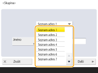 (e-mail), (fax), (I-fax) nebo (soubor) můžete filtrovat místa určení zobrazená v seznamu adres ( ). Stiskněte <Vše>, chcete-li zobrazit všechna uložená místa určení. <Detaily/Editovat>